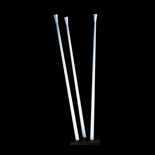 Floor lamp with printed aluminium base, orientable pipes in painted aluminium, lamp shade in porcelain. 3 Halogen bulbs 150W.
