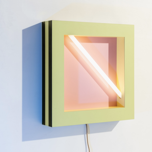 Wall lamp in wood and plastic laminate with alternating layers of colour, and with a neon light embedded within the frame.