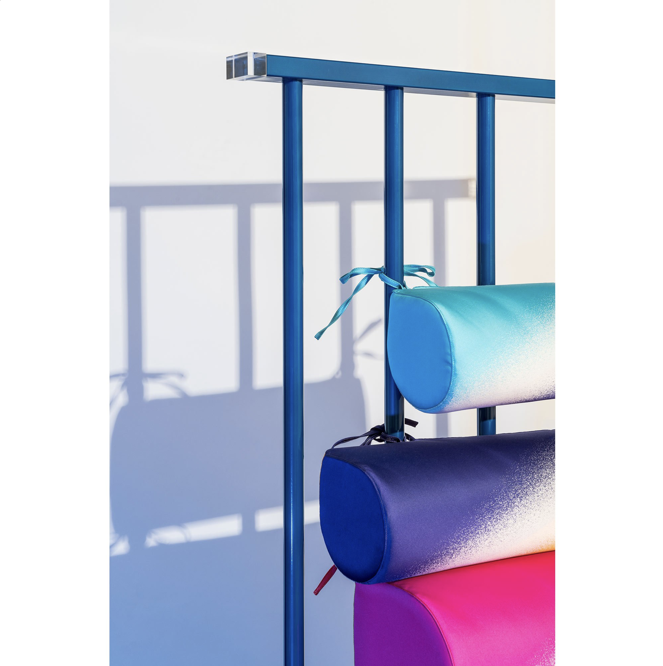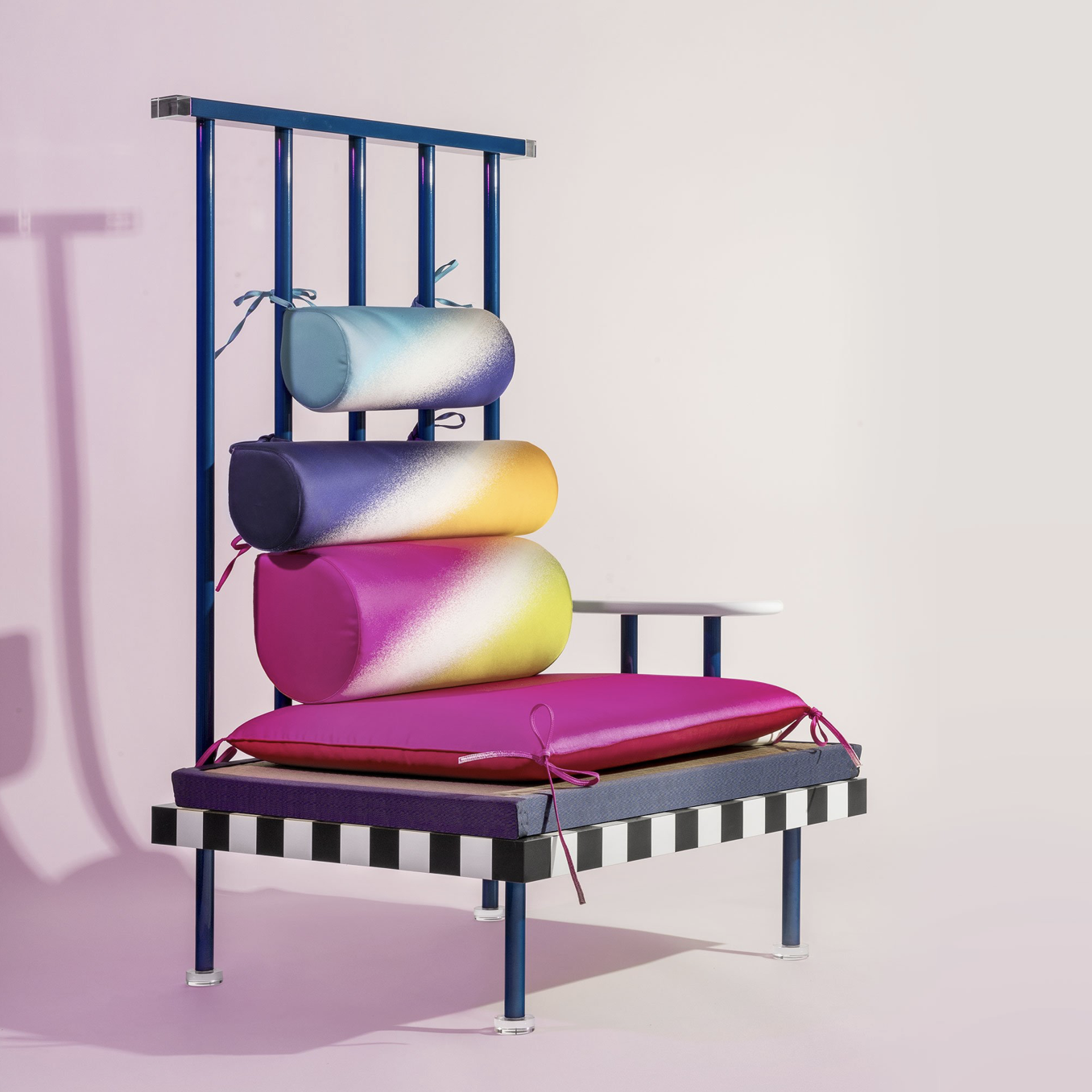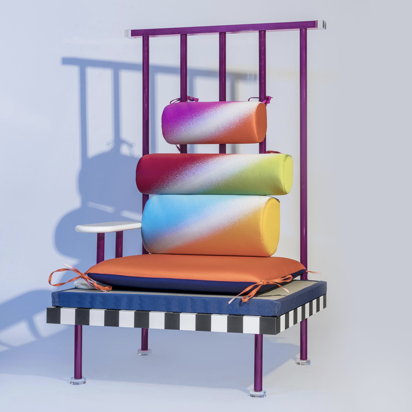Black and white laminate and painted metal structure with Japanese tatami mat and plexiglass feet. Silk cushions in various colours and a removable lacquered armrest